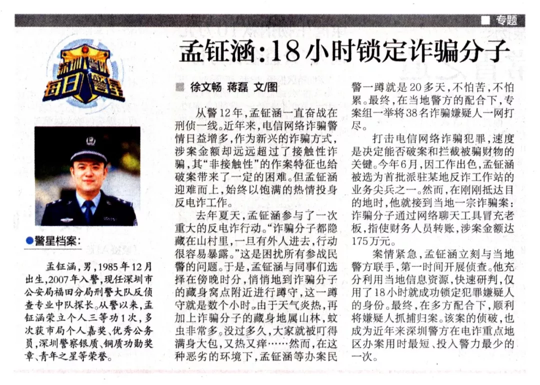 案情緊急,孟鉦涵立刻與當(dāng)?shù)鼐铰?lián)手,第一時(shí)間開(kāi)展偵查。他充分利用當(dāng)?shù)匦畔①Y源,快速研判,僅用了18小時(shí)就成功鎖定犯罪嫌疑人的身份。最終,在多方配合下,順利將嫌疑人抓捕歸案。該案的偵破,也成為近年來(lái)深圳警方在電詐重點(diǎn)地區(qū)辦案用時(shí)最短、投入警力最少的一次。