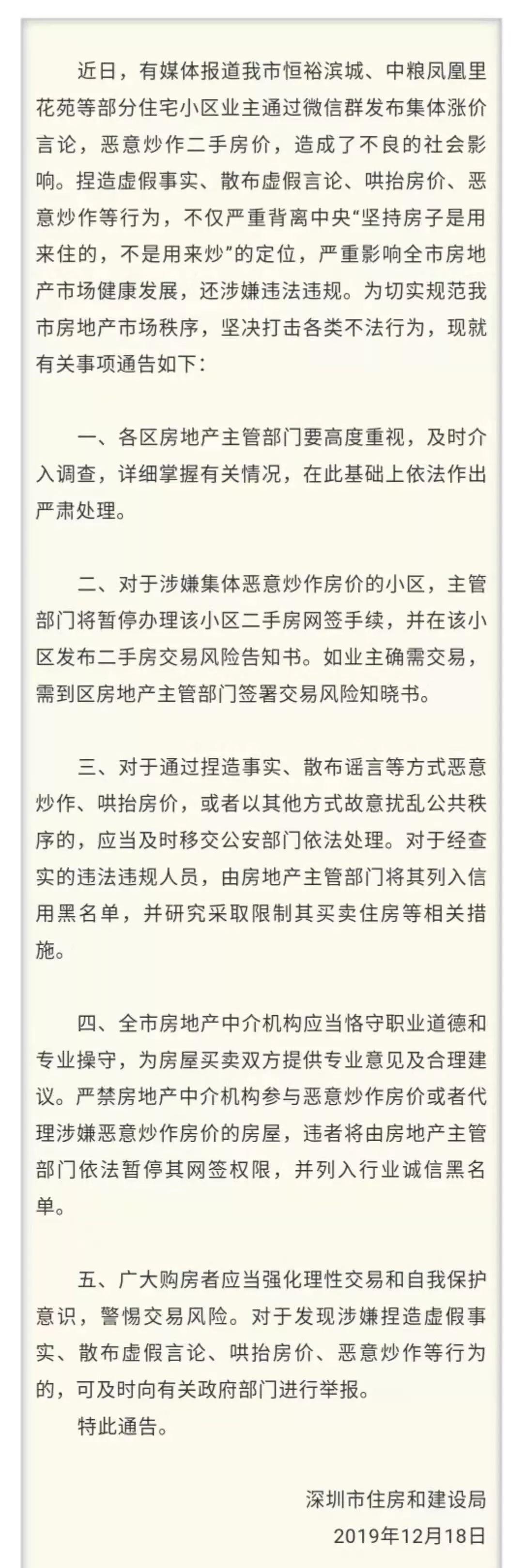12月18號(hào)深圳市住建局發(fā)布通稿稱(chēng)嚴(yán)厲打擊哄抬房?jī)r(jià)等違規(guī)行為