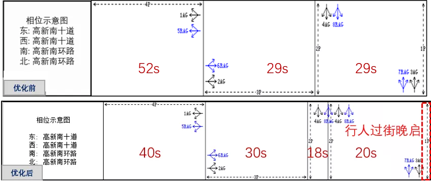 拆分北進口機動車時間,行人晚啟,以減少北進口左轉機動車與南面出口側行人交織。