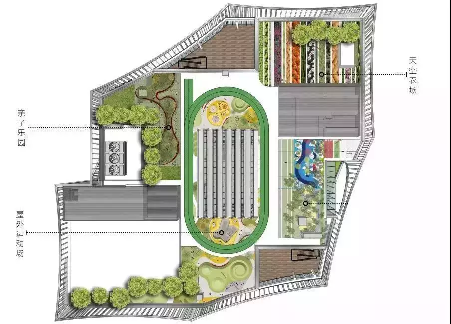 屋頂農(nóng)場(chǎng)充分利用空間,打造天空農(nóng)場(chǎng)、親子樂(lè)園、屋外運(yùn)動(dòng)場(chǎng)。空中的跑道,肥沃的土壤,瓜果蔬菜的金色豐收,讓自然在城市落地生根。小朋友們可以在其中,種植汗水,開(kāi)花結(jié)果,收獲自然的饋贈(zèng)。