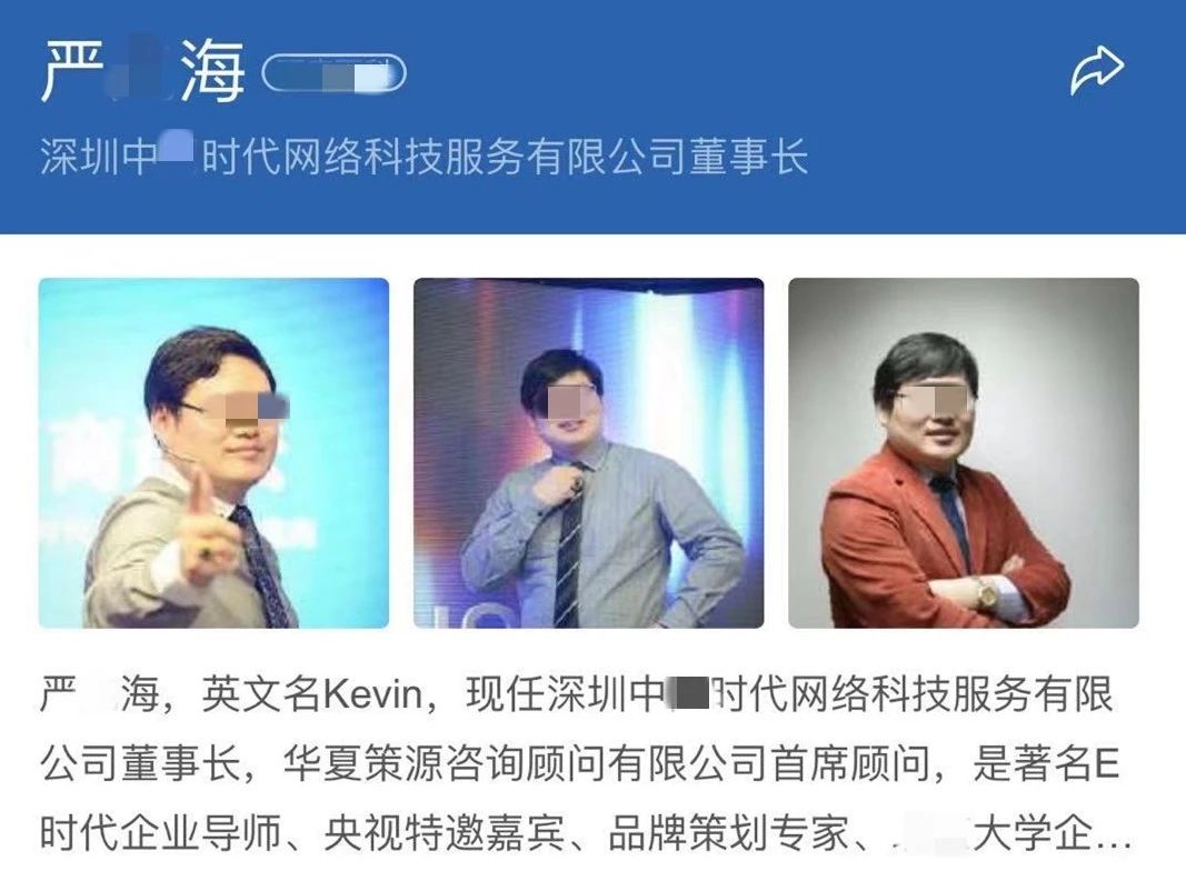 據(jù)介紹,董事長“嚴(yán)某海”對(duì)外宣傳資料顯示:著名E時(shí)代企業(yè)導(dǎo)師、品牌策劃專家、某知名大學(xué)企業(yè)轉(zhuǎn)型升級(jí)總裁班實(shí)踐導(dǎo)師,擔(dān)任過多家知名企業(yè)的顧問。據(jù)被抓獲的團(tuán)伙成員交代,嚴(yán)某海自稱擁有雙碩士學(xué)歷,是香港大學(xué)學(xué)者,還是牛津大學(xué)博士。