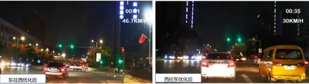 優(yōu)化后,東往西平均車速穩(wěn)定在43.7KM/H,西往東平均車速穩(wěn)定于30.5KM/H,且雙向均可不停車通過各路口,有效將路口車速控制于50KM/H以內(nèi),保證路段駕駛體驗(yàn)的同時(shí)提升了路段安全性。