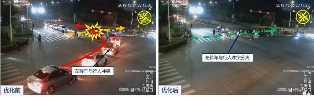 優(yōu)化改善后,路口夜間周期由102秒下降至87秒,路口空放明顯減少;人、車交叉沖突點(diǎn)數(shù)由2個(gè)減少至0個(gè),基本實(shí)現(xiàn)人車獨(dú)立通行路權(quán),行人過街安全得以保障。
