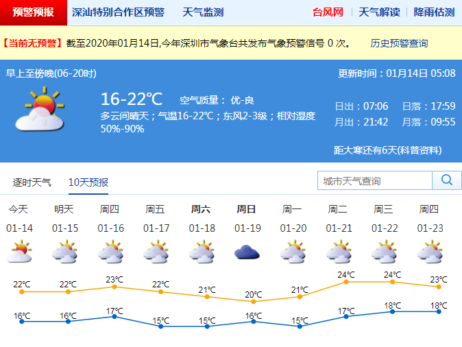 見圳客戶端·深圳新聞網(wǎng)2020年1月14日訊 深圳市氣象局預(yù)計14-15日多云為主,14日氣溫15-22℃;16日多云轉(zhuǎn)陰天,偶有零星小雨;17-19日冷空氣影響,多云到陰天,氣溫下降2-3℃,早晚較涼;20日起氣溫逐日回升。