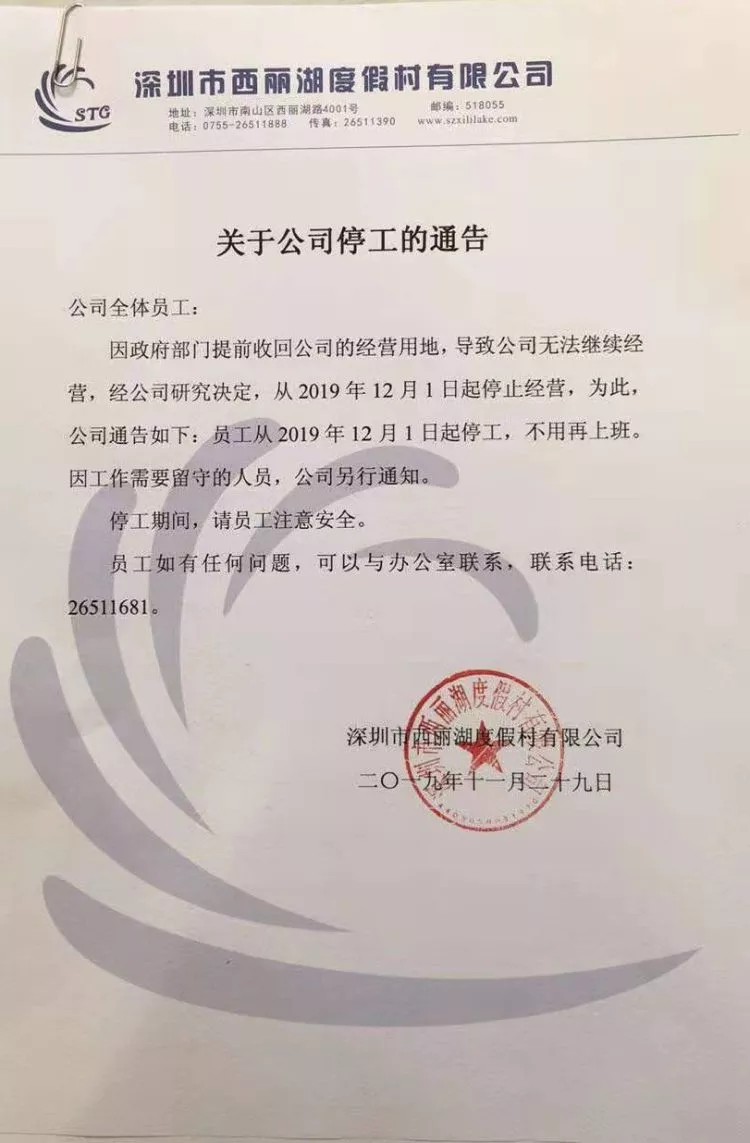 2019年11月29日,西麗湖度假村發(fā)布通告稱,政府提前收回經營用地,從2019年12月1日停止營業(yè),已經不接待外來游客,員工同時停工——這意味著市民所熟知的西麗湖度假村即將走下舞臺。