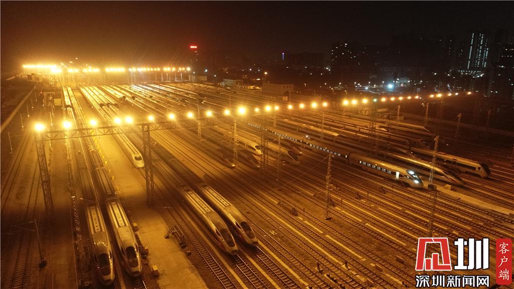 1月15日凌晨,深圳動(dòng)車(chē)運(yùn)用所內(nèi)的高鐵列車(chē)。