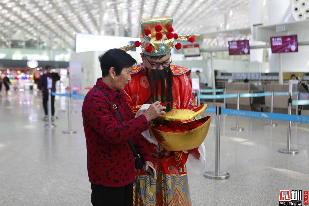 深圳航空工作人員扮“財(cái)神”給旅客送紅包。