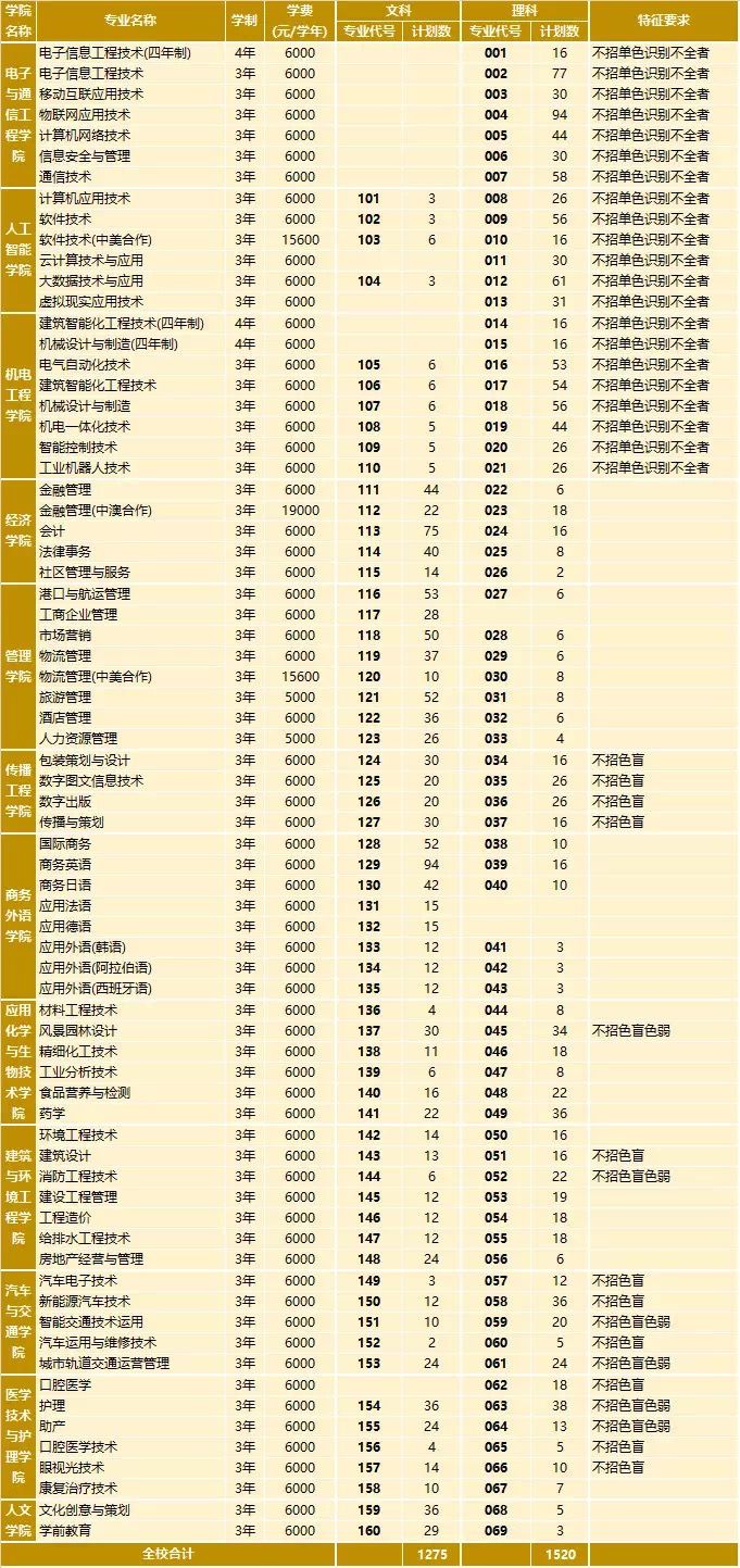 ②以下各招生專(zhuān)業(yè)、專(zhuān)業(yè)代號(hào)、計(jì)劃數(shù)、選報(bào)證書(shū)、特征要求等及其它備注以廣東省招生辦公布的專(zhuān)業(yè)目錄為準(zhǔn);