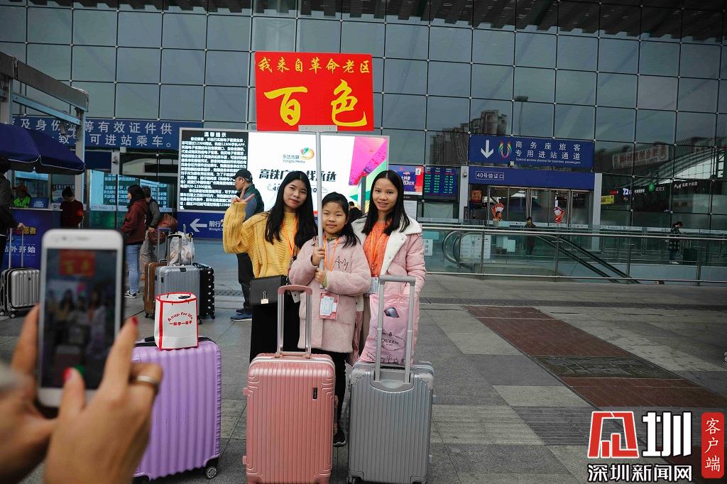 深圳北站西廣場(chǎng)進(jìn)站口,三位搭乘本次愛(ài)心專列的乘客正在合影。