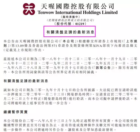 與此同時,天喔國際更新了自家清盤呈請的最新消息?!?/p>
