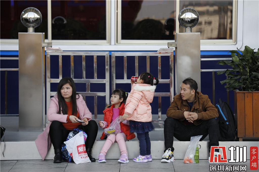 深圳北站東廣場,兩個小女孩正和家人等車。