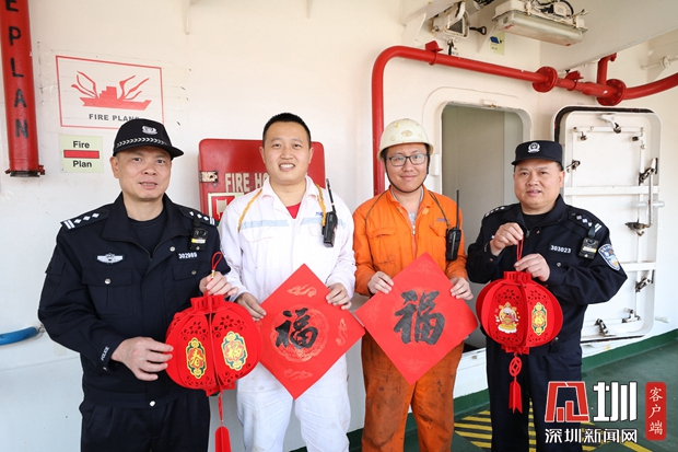 為了讓國際船舶上工作的中國籍船員感受到濃厚的春節(jié)氣息,鹽田邊檢站開展“迎春送福”登輪走訪活動(dòng)。在實(shí)施登輪檢查的同時(shí),向國際船舶上的中國籍船員贈(zèng)送春聯(lián)、燈籠、中國結(jié)等節(jié)慶用品,將中國的“年”送上國際船舶,向船員送上新春祝福、節(jié)日問候。