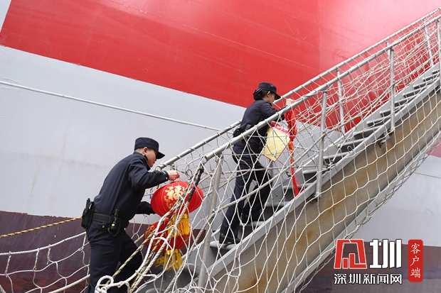 鹽田邊檢站登輪送春聯(lián)、燈籠,將中國(guó)年送上國(guó)際船舶。