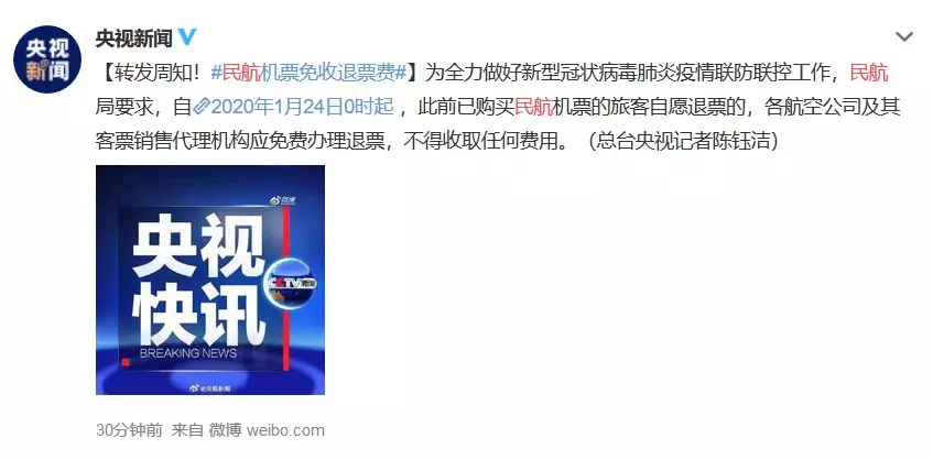 為全力做好新型冠狀病毒肺炎疫情聯(lián)防聯(lián)控工作,民航局要求,自2020年1月24日0時(shí)起,此前已購買民航機(jī)票的旅客自愿退票的,各航空公司及其客票銷售代理機(jī)構(gòu)應(yīng)免費(fèi)辦理退票,不得收取任何費(fèi)用。