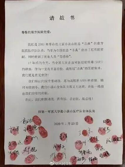 請戰(zhàn)的人員中,有十多年前曾遠赴小湯山抗擊“非典”的隊員,有其他在職的醫(yī)生和護理工作者,還有表示“若有戰(zhàn),召必回!不計報酬,無論生死”的離退休老干部群體。一封寫滿簽名并按滿紅手印的“請戰(zhàn)書”,就像跳動著一顆顆紅心的畫卷,引發(fā)網友紛紛感動留言。