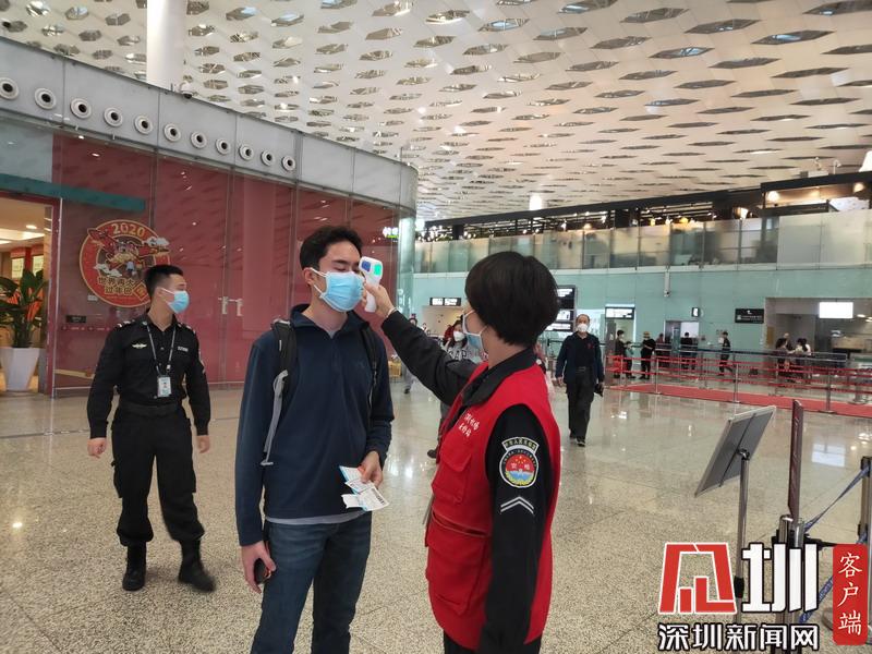 在深圳機(jī)場,工作人員對(duì)往來乘客進(jìn)行體溫檢測。