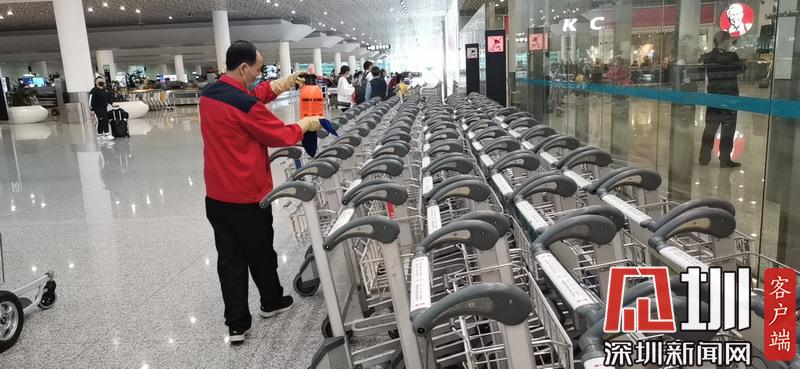 深圳機(jī)場工作人員對(duì)行李推車進(jìn)行消毒。