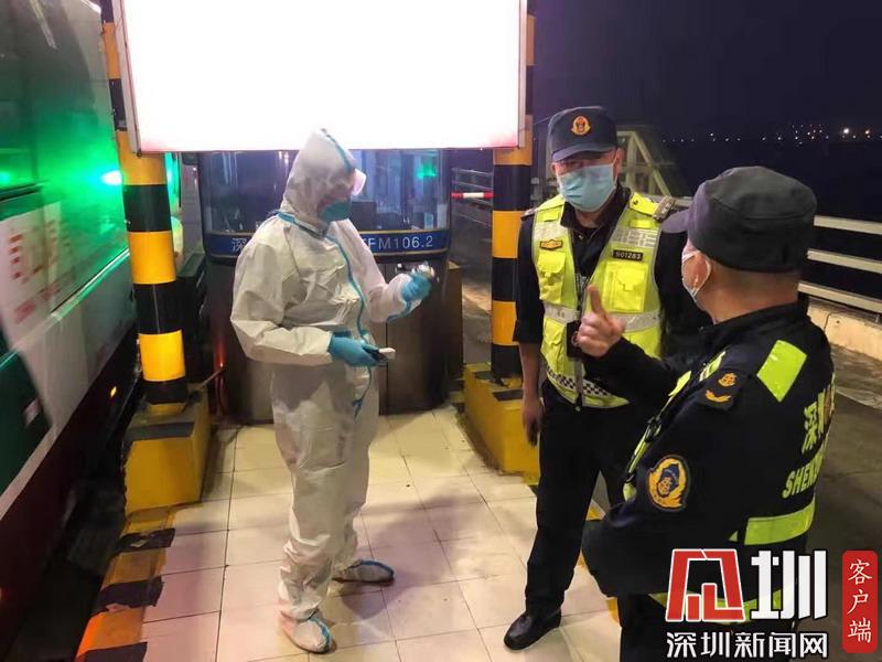 26日下午深圳黃鶴收費(fèi)站,深圳交警對(duì)往來司機(jī)進(jìn)行體溫檢測。