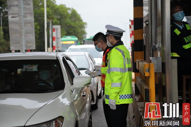 26日下午深圳黃鶴收費(fèi)站,深圳交警對往來司機(jī)進(jìn)行體溫檢測。