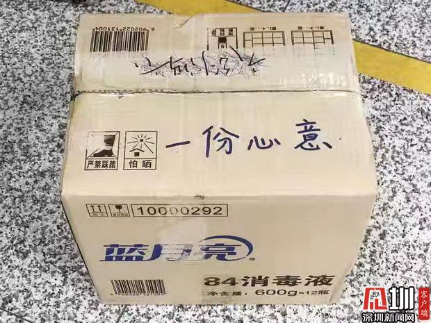 2020年1月30日晚20:55分,深圳地鐵梅村站工作人員正在安檢口執(zhí)勤時(shí),一名戴著口罩的男子走進(jìn)來,放下一個箱子便轉(zhuǎn)身離去。工作人員發(fā)現(xiàn)箱子上寫著“一份心意”四個字,打開發(fā)現(xiàn)箱內(nèi)有12瓶84消毒液,正欲上前感謝時(shí),男子已匆匆離開,只留下了一個背影。