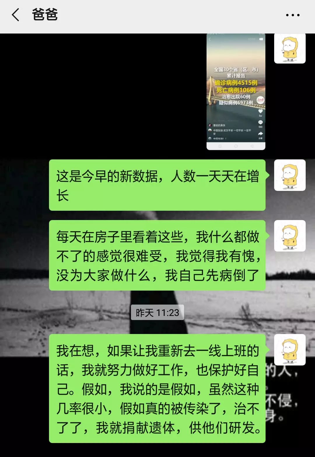 高強(qiáng)度的密閉性工作,李生蘭病倒了,病床上她依然數(shù)次“請戰(zhàn)”。在發(fā)給爸爸的微信中,她寫道,“假如我倒在了崗位上,請捐獻(xiàn)我的遺體!”把我的遺體捐獻(xiàn),我希望能為這次疫情做點什么!
