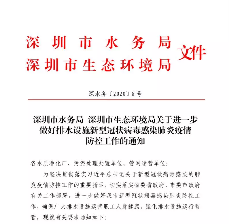 早在1月30日,深圳市水務(wù)局、深圳市生態(tài)環(huán)境局就聯(lián)合發(fā)布了《關(guān)于進(jìn)一步做好排水設(shè)施新型冠狀病毒感染的肺炎疫情防控工作通知》(以下簡(jiǎn)稱(chēng)《通知》),提前部署,明確要求全市要全力以赴做好排水設(shè)施疫情防控工作。