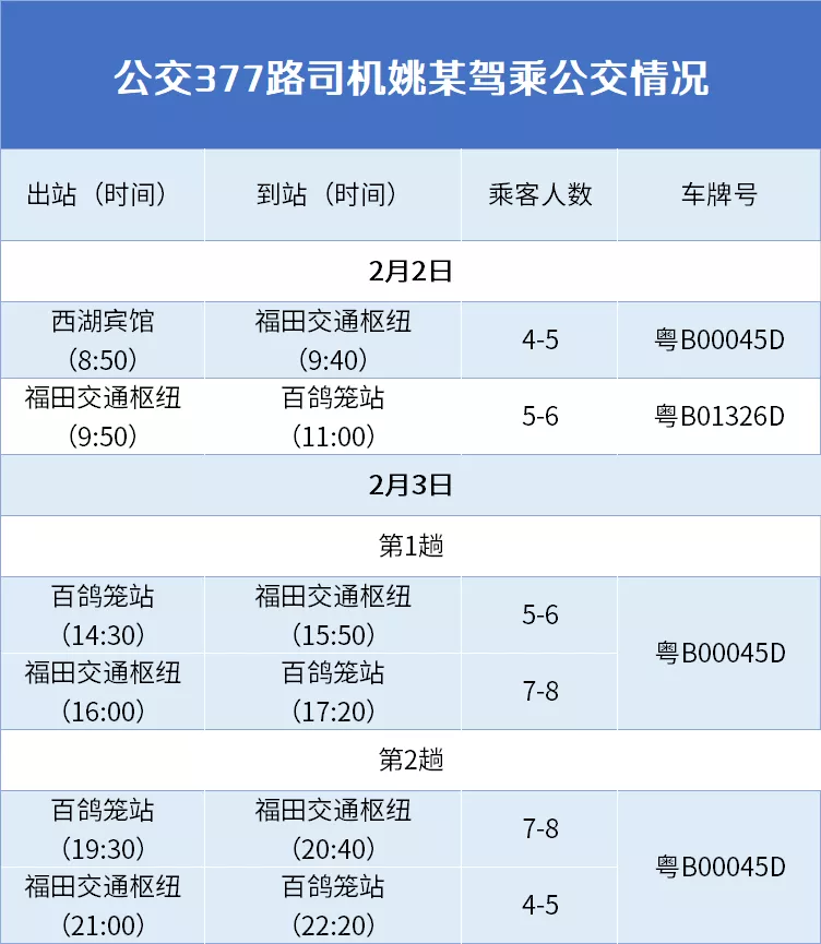 2月3日,姚某經(jīng)過(guò)崗前體溫檢測(cè)正常后,分別于14時(shí)30分至17時(shí)20分(粵B00045D)、19時(shí)30分至22時(shí)20分(粵B00045D)駕車往返白鴿籠站至福田交通樞紐兩趟,乘客共27名。期間車載視頻確認(rèn)姚某佩戴口罩、車輛有出站前后消殺記錄、運(yùn)行途中開(kāi)窗通風(fēng)。當(dāng)晚22:20下班回家后,姚某接江西老家告知,其在老家接觸過(guò)的堂弟已確診感染新冠病毒。