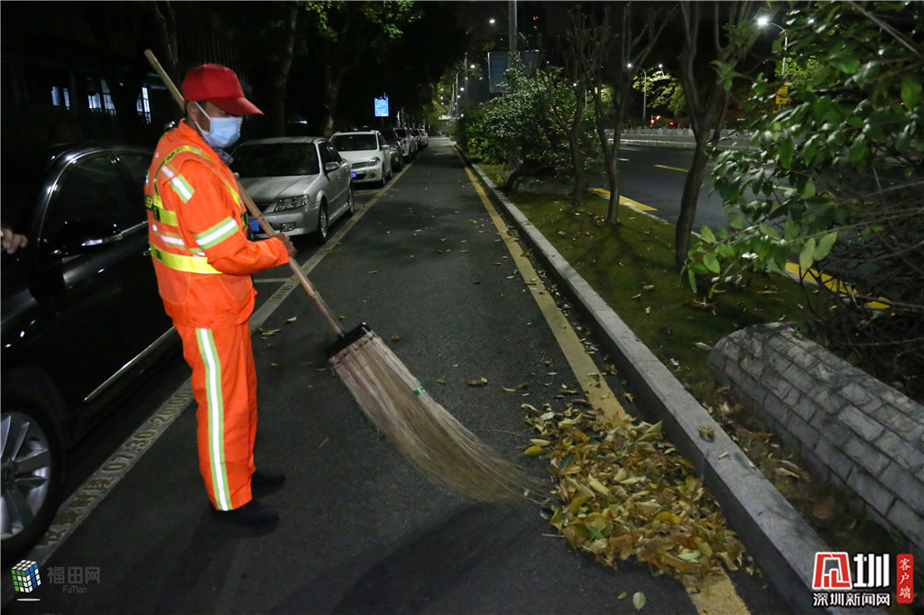 來自湖南的田朝勝,在清潔工人這個崗位已經(jīng)工作10年,每天清晨他都在清掃著這個片區(qū)路面,地面上泛黃的葉子在黑夜里被他掃的沙沙作響。他說,疫情期間,很多環(huán)衛(wèi)人員回老家后再想回深圳就沒那么容易了,有很多老鄉(xiāng)被隔離了回不來?!跋M蹅兊娜兆于s快好起來吧,2020年一天比一天過得好?!碧锍瘎俑锌?。