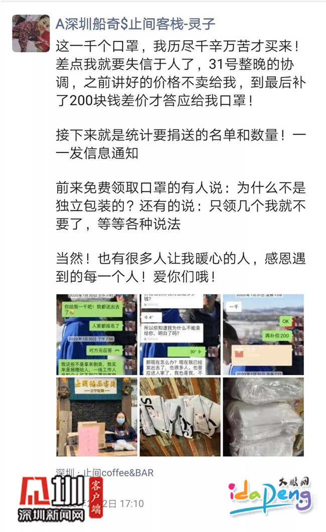 口罩作為最重要的防護(hù)物資之一,在這場疫情防控戰(zhàn)打響后需求量迅速增加,市面上的口罩供不應(yīng)求。大鵬新區(qū)女性創(chuàng)客示范民宿止間客棧老板黃靈芝在這樣的困局中仍想出份力,于是輾轉(zhuǎn)聯(lián)系上了在尼泊爾的朋友,從1月29日到31日,連續(xù)3天反復(fù)溝通協(xié)調(diào),終于買到了1000個(gè)口罩,免費(fèi)贈(zèng)送給市民以解燃眉之急。過程千辛萬苦,結(jié)果暖人暖心,她在朋友圈寫到:感恩遇到的每一個(gè)人。