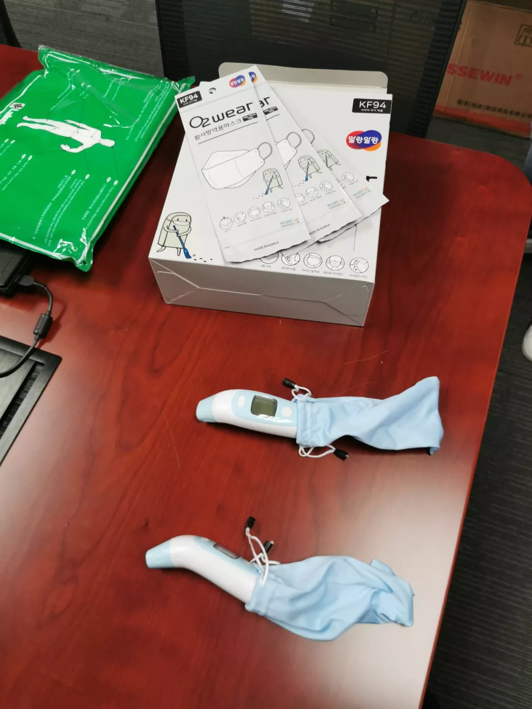 企業(yè)的口罩、測(cè)溫儀等防疫物資。新華社記者孫飛2月7日攝