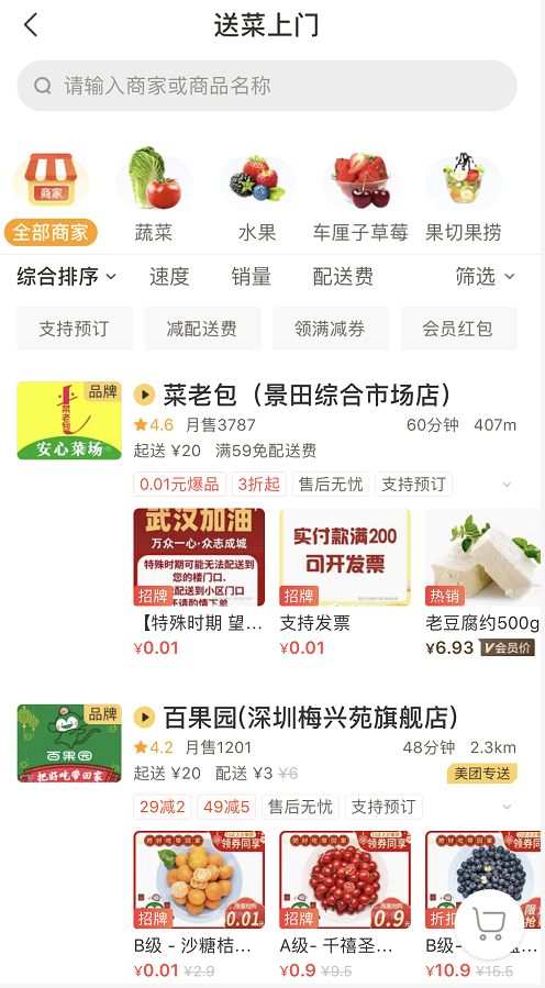 商品情況:店鋪相對較少,但果蔬肉禽海鮮齊全;另外,部分門店休息中,可先看看自己所在地區(qū)是否提供配送。