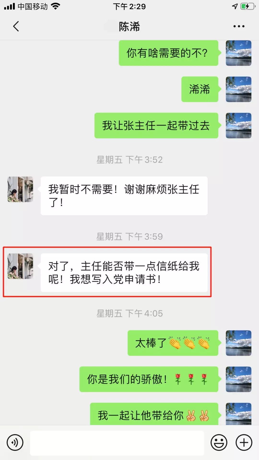 “主任能否帶一點(diǎn)信紙給我呢!我想寫入黨申請書!”陳浠在戰(zhàn)疫一線向組織發(fā)出了入黨申請!