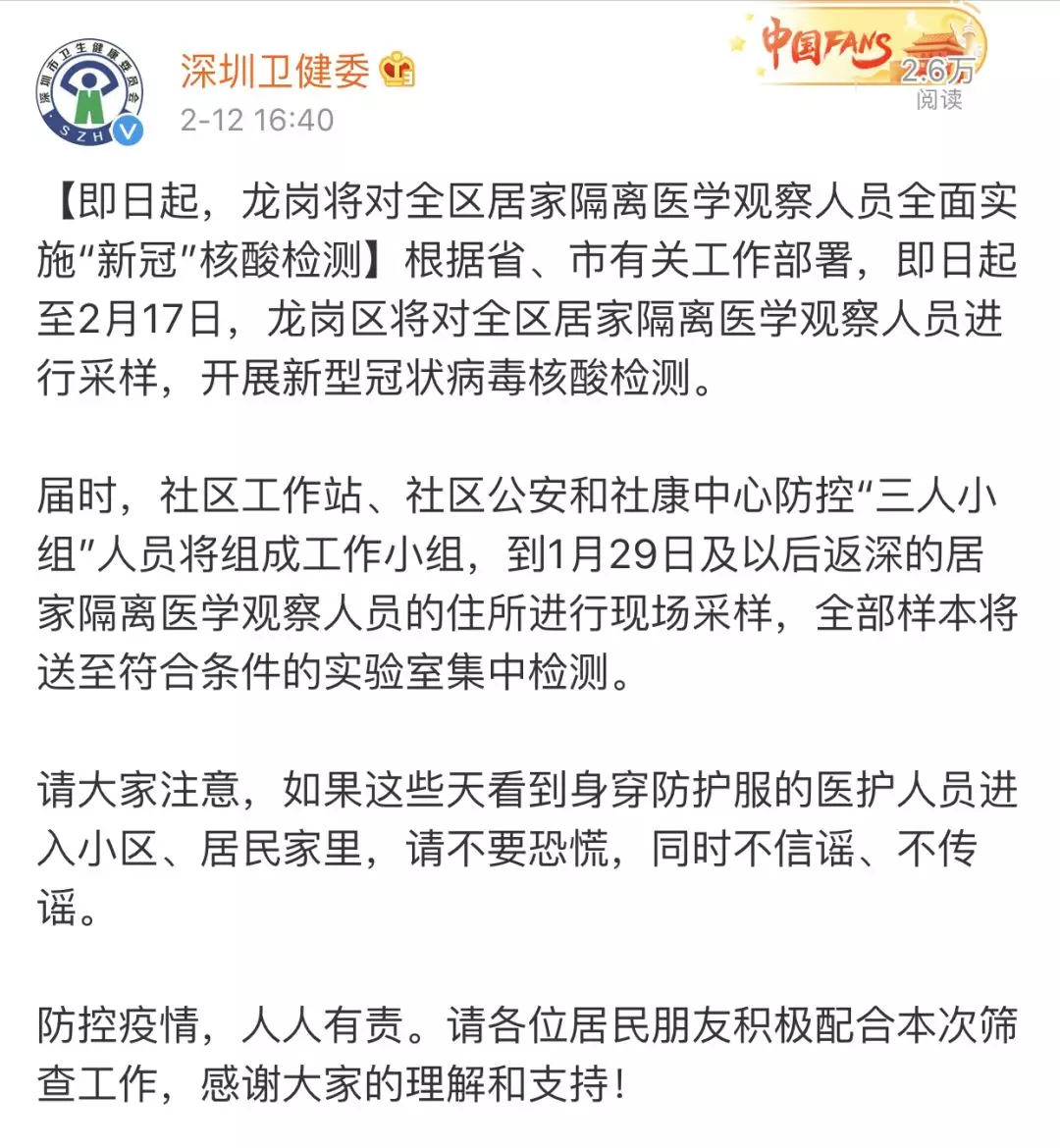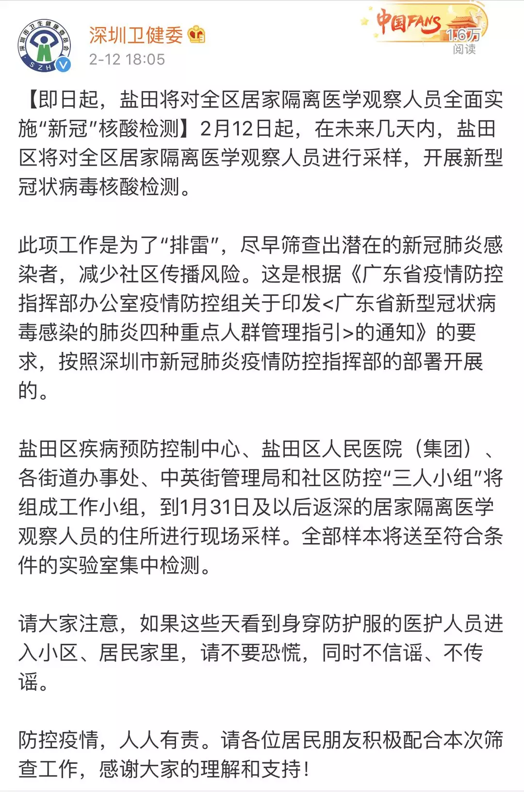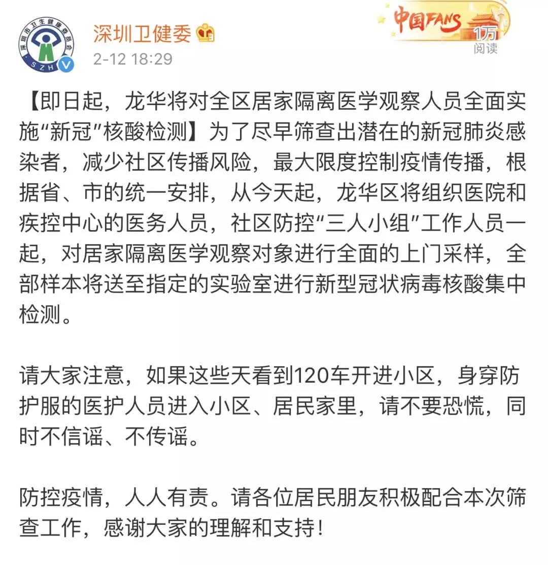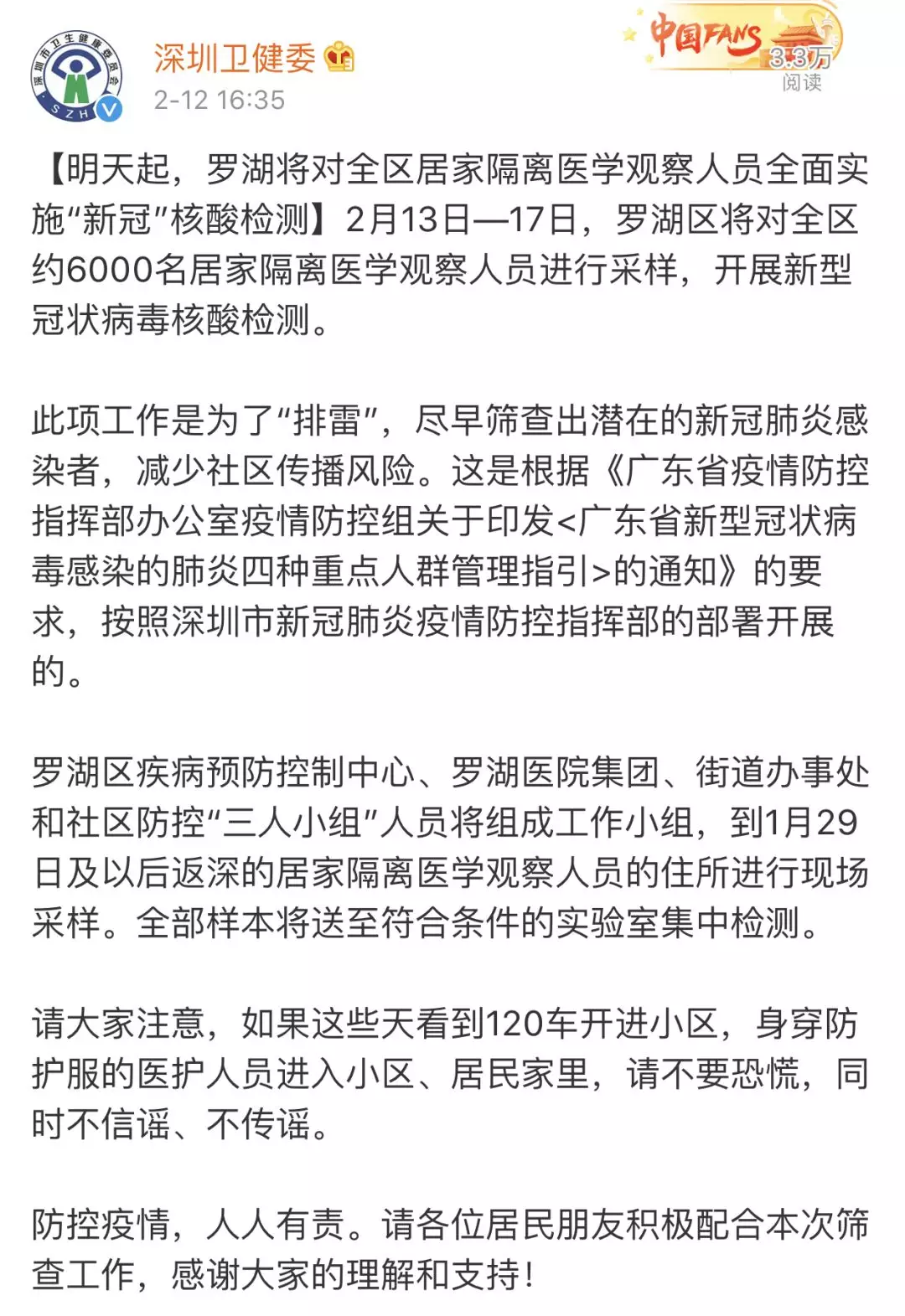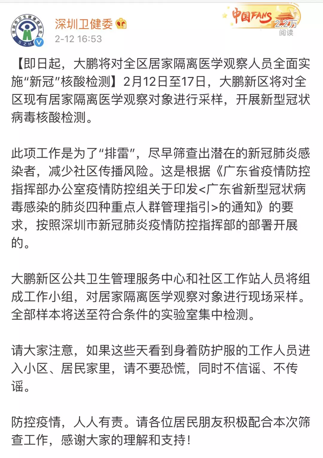 為防范新冠病毒感染疫情的社區(qū)傳播,切實(shí)做到早發(fā)現(xiàn)、早隔離、早診斷、早治療,2月12日起,深圳各區(qū)(新區(qū))均為所有居家隔離醫(yī)學(xué)觀察人員檢測新型冠狀病毒核酸。