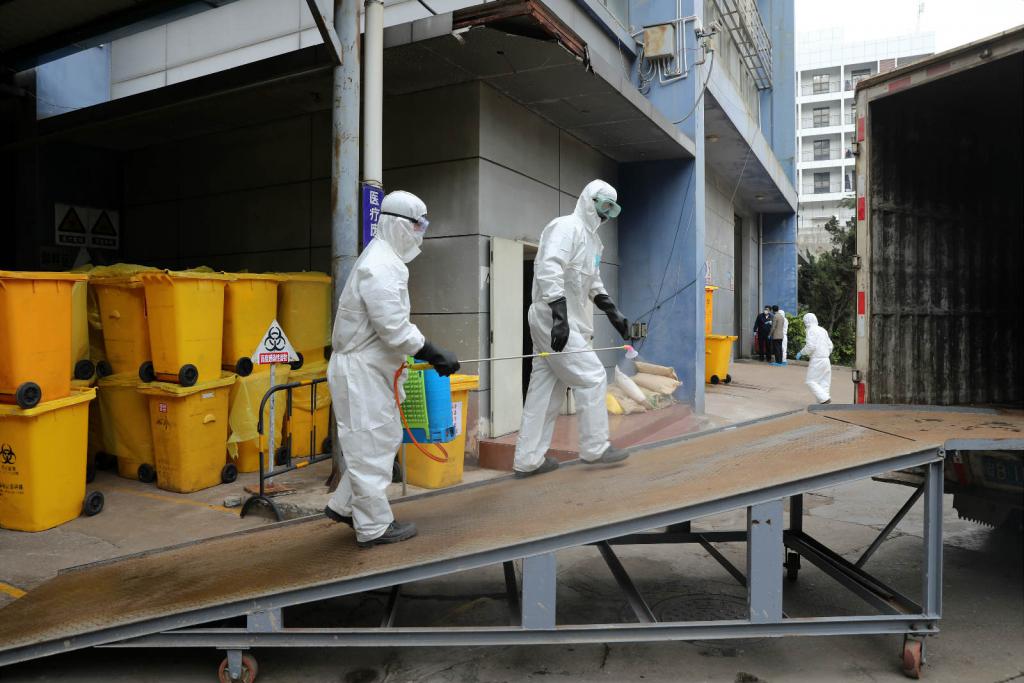 ▲卸完醫(yī)療廢物后,工作人員對堆放區(qū)域進行消毒。