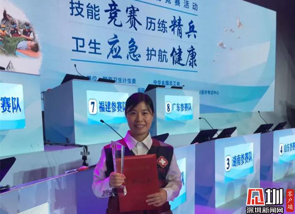 曠翠萍在全國衛(wèi)生應(yīng)急技能大賽獲獎(jiǎng)現(xiàn)場(chǎng)。