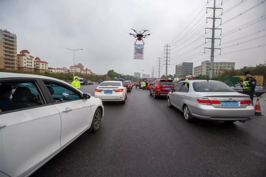 2月11日,在G94高速深圳觀瀾收費處,深圳龍華機訓大隊無人機飛行隊的民警操作懸掛有申報二維碼的無人機在候檢的車輛間飛行。