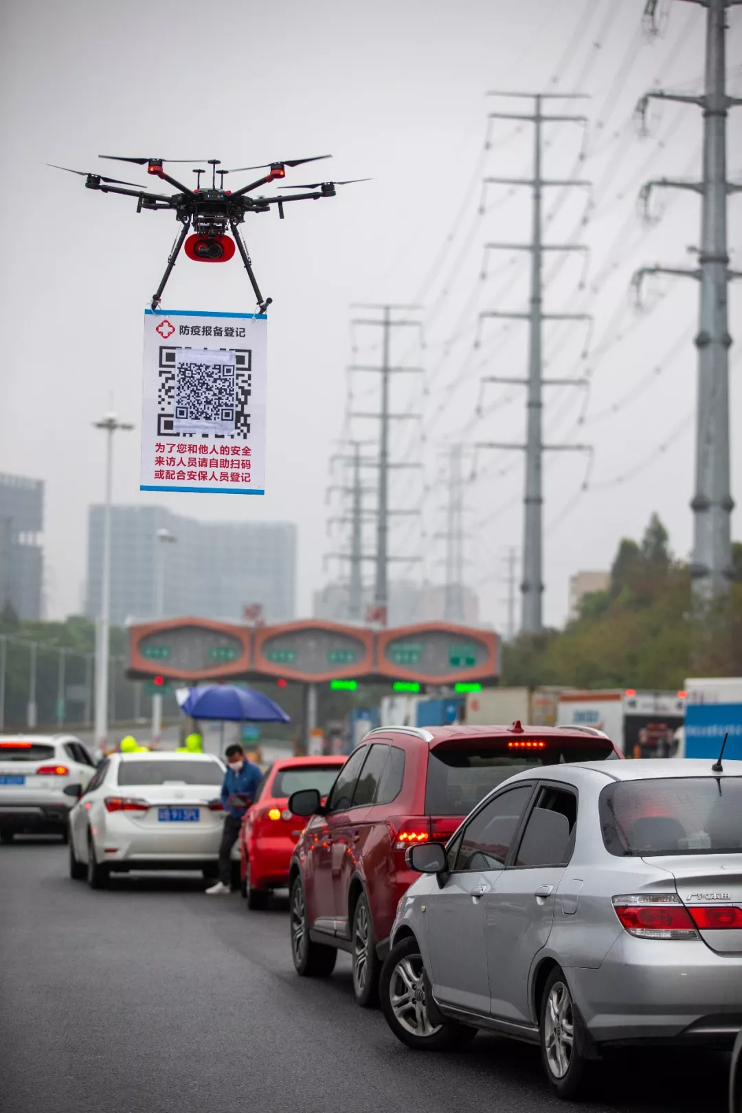 2月11日,在G94高速深圳觀瀾收費(fèi)處,深圳龍華機(jī)訓(xùn)大隊(duì)無(wú)人機(jī)飛行隊(duì)的民警操作懸掛有申報(bào)二維碼的無(wú)人機(jī)在候檢的車(chē)輛間飛行。