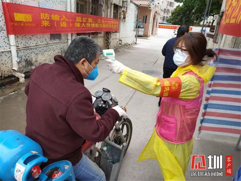 來自龍崗區(qū)南嶺村的鄧育芳,是不少租戶的房東,也是值守在南嶺南路黨員先鋒崗的一名村民志愿者。連續(xù)十多天,她每天在村口站立整整7個小時,不停為出入居民測量體溫、詢問來源地、查驗申報二維碼、引導(dǎo)注冊。