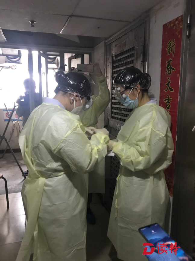 孫女士打開(kāi)門,將工作人員遞進(jìn)去的防護(hù)裝備穿戴完畢?!盀榱吮Wo(hù)醫(yī)護(hù)人員的安全,減少交叉感染的可能性,所有的上門檢測(cè)都會(huì)在樓道里進(jìn)行。”社康中心工作人員說(shuō)。提前穿好防隔服等防護(hù)裝備、拿檢測(cè)時(shí)給居民坐的凳子、為凳子消毒,開(kāi)始進(jìn)行檢測(cè)前就需要做很細(xì)致的準(zhǔn)備工作。