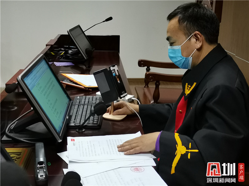 2月13日晚上8點(diǎn),龍崗法院橫崗法庭第二審判庭庭長(zhǎng)張國(guó)輝在運(yùn)用掌上法庭審理一宗農(nóng)民工追討欠薪的勞務(wù)糾紛案件。