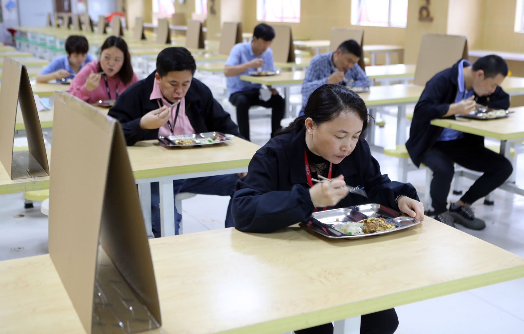 這樣的座位安排方式和擋板在員工食堂同樣可以看到。不同的是,就餐員工被嚴格分流,采取多時段少人次的方式分時段分批就餐。