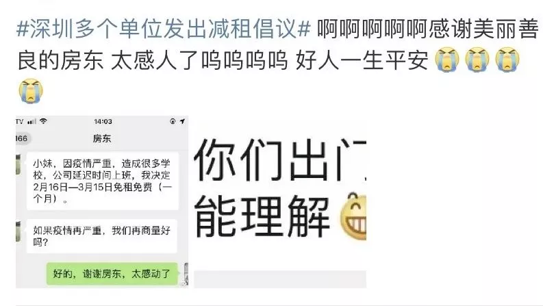 C******a:我有一位龍崗朋友是房東,他們給所有租客都減免了半個月的房租。暖心感動!