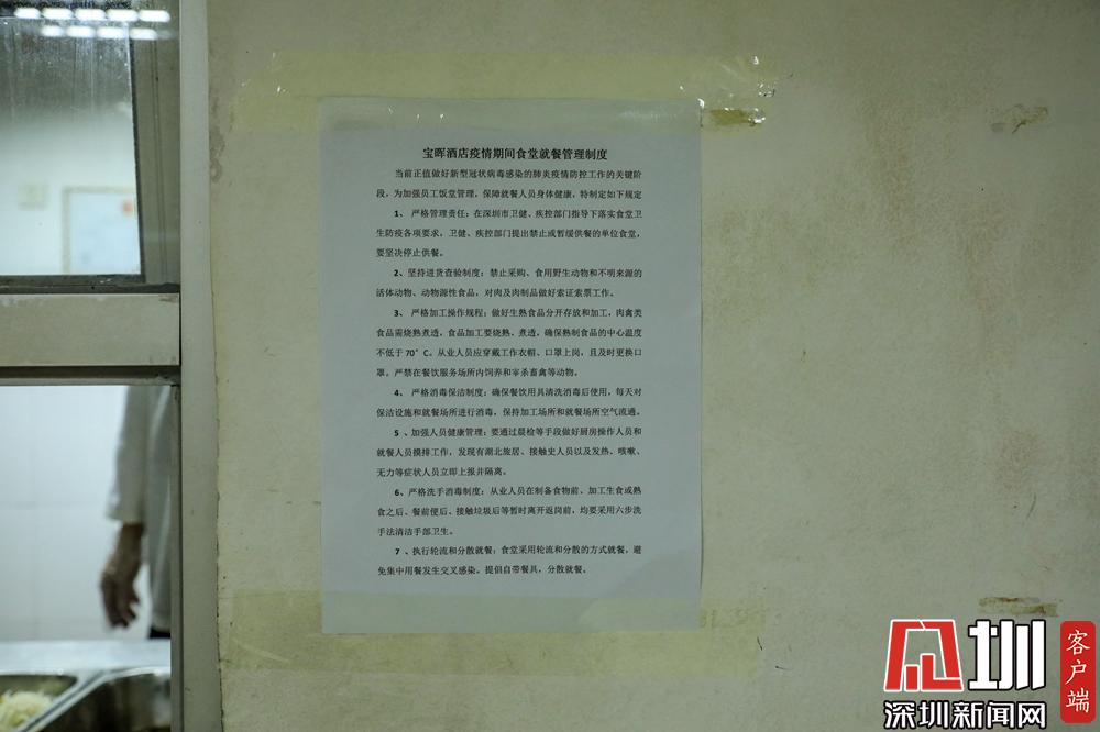 和大部分酒店選擇關(guān)閉餐廳不同,寶暉酒店員工食堂仍然開放,但是制定了嚴格的就餐制度,實行分時段就餐、由廚師統(tǒng)一打飯菜、按統(tǒng)一朝向間隔就坐等規(guī)定。