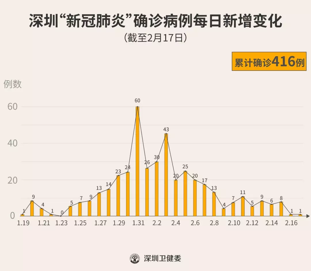 截至2月17日24時(shí),深圳累計(jì)報(bào)告“新冠肺炎”確診病例416例。2月17日當(dāng)天全市新增確診病例1例(個(gè)案詳情今晚公布)。
