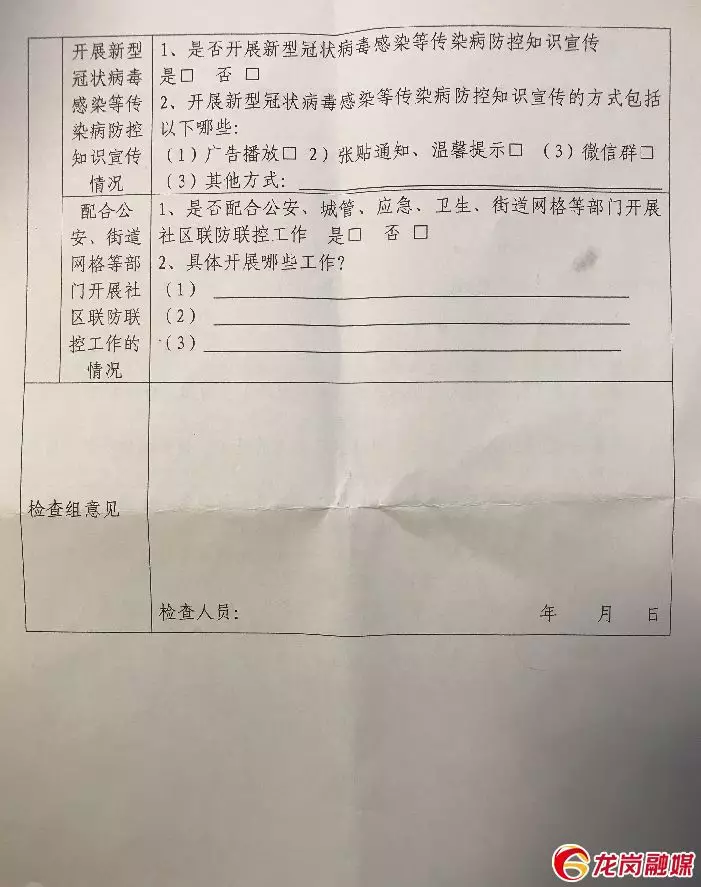 A:區(qū)住建局11組檢查人員都手握一張《龍崗區(qū)物業(yè)服務(wù)企業(yè)新型冠狀病毒防控工作檢查表》,其中按照“物業(yè)服務(wù)企業(yè)對(duì)企業(yè)從業(yè)人員的疫情防控情況”“口罩、手套等一次性衛(wèi)生用品專用垃圾桶的設(shè)置情況”“物業(yè)服務(wù)企業(yè)防疫責(zé)任落實(shí)情況”“開展新型冠狀病毒感染等傳染病防控知識(shí)宣傳情況”“配合公安、街道網(wǎng)格等部門開展社區(qū)聯(lián)防聯(lián)控工作情況”等五大類17條檢查內(nèi)容展開檢查,視情況評(píng)定“紅榜”或“黑榜”。