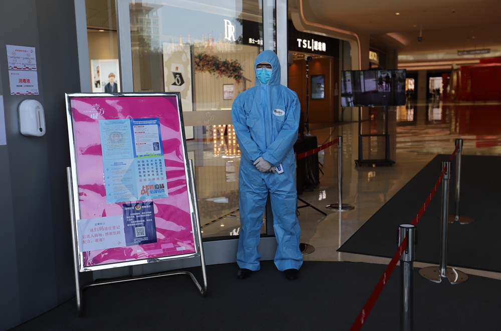 當(dāng)天上午11時,記者來到壹方城,過去熱鬧的正門廣場上如今僅有寥寥幾個行人。往大門走去,記者看到兩側(cè)的門已經(jīng)關(guān)閉,只留下中間的通道給市民進出,進口和出口分開,市民進入商場時必須掃碼實名登記,身著防護服的工作人員在入口處引導(dǎo)市民登記和測溫。