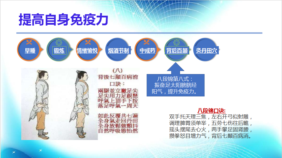 6.背后百顛:背后百顛從養(yǎng)生方法“八段錦”演化而來,口訣如下:雙手托天理三焦,左右開弓似射雕,