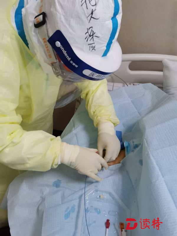 深圳醫(yī)療隊(duì)臨時(shí)黨支部書記王玲在監(jiān)利縣中醫(yī)院重癥病房為患者植入PICC導(dǎo)管。