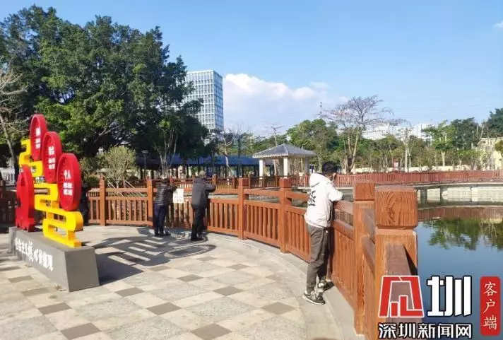 在光明區(qū)塘家公園,每隔一小段距離,就有零星幾個當?shù)氐娜罕?,在公園的池塘邊觀賞風景,散散心,均有佩戴口罩。