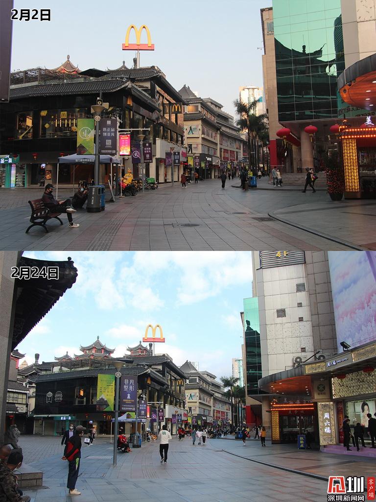 上圖為2月2日,在東門步行街人煙稀少,下圖為2月24日,東門步行街進(jìn)入復(fù)工第一天,營(yíng)業(yè)的店面開始增多。